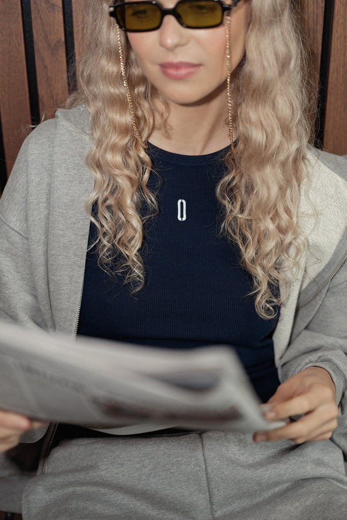 Tamsiai mėlynos, aukštos kokybės tekstūros trikotažas, pagamintas iš ekologiškos medvilnės, suteikia minkštumo ir komforto. Dizainą papildo minimali išsiuvinėta emblema, suteikianti elegantišką ir subtilų akcentą, puikiai tinkantį stilingam ir patogiam kasdieniniam įvaizdžiui.