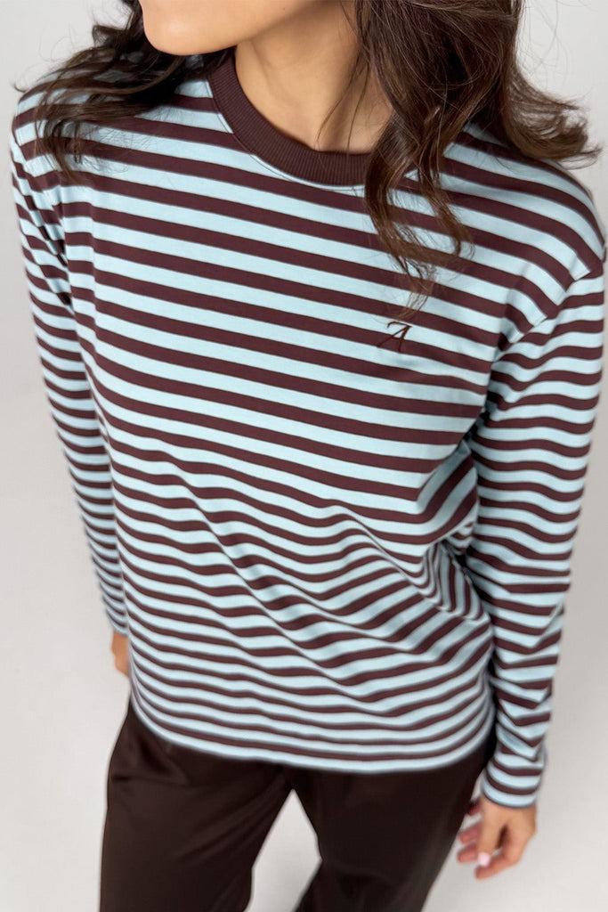 Minimalistiniai, bet išskirtiniai - dryžuoti marškinėliai ilgomis rankovėmis, sukurti kasdieniam dėvėjimui. Ruda ir švelniai melsva spalvų kombinacija suteikia subtilaus charakterio ir lengvai dera tiek prie džinsų, tiek prie laisvalaikio ar sportinio stiliaus aprangos. Išsiuvinėtas Atella inicialas.