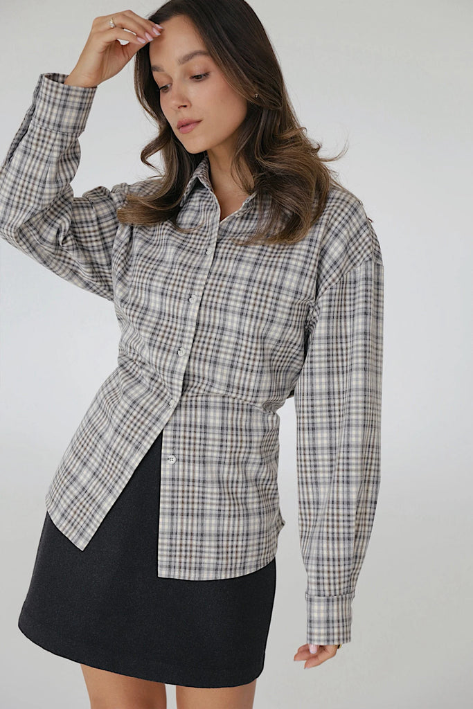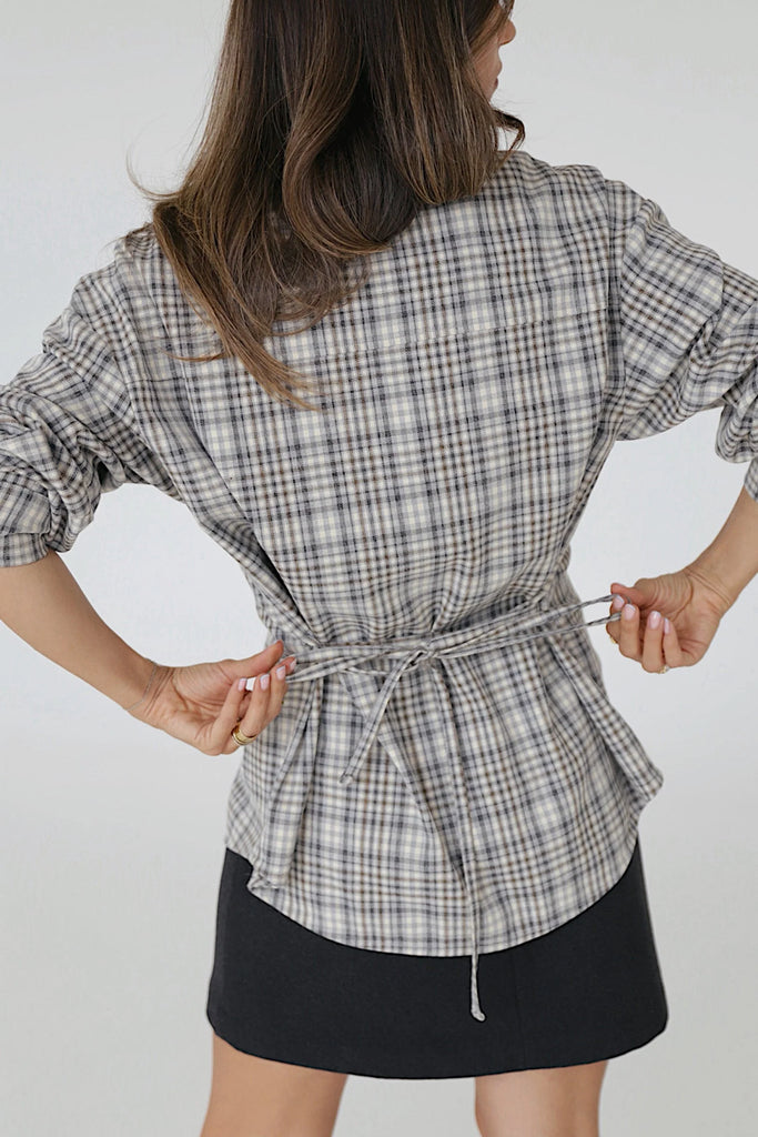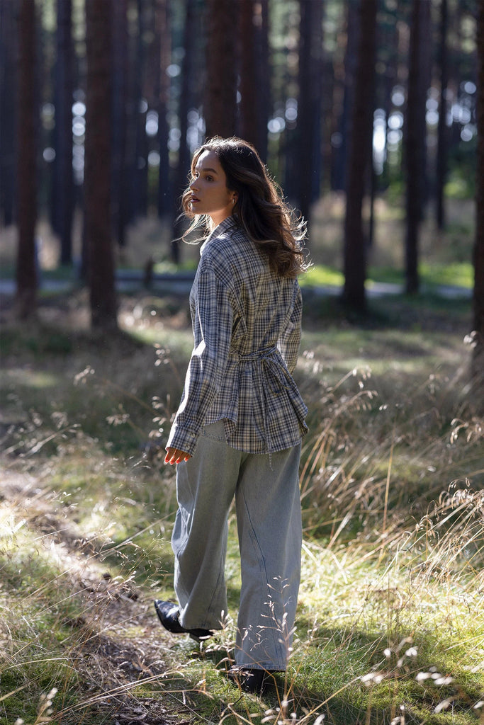 Languoti, laisvo kirpimo marškiniai su dirželiu nugaroje. Šie marškiniai yra unikalūs savo universalumu, juos galima dėvėti ir laisvus, tačiau norint pabrėžti juosmenį - galima susirišti kaspiną nugaroje. Audinys pasižymi yra storesnis, minkštas, puikiai išlaiko formą bei nesiglamžo. Tai drabužis, kuris tarnaus jūsų spintoje daugelį sezonų ir puikiai tiks įvairioms progoms.