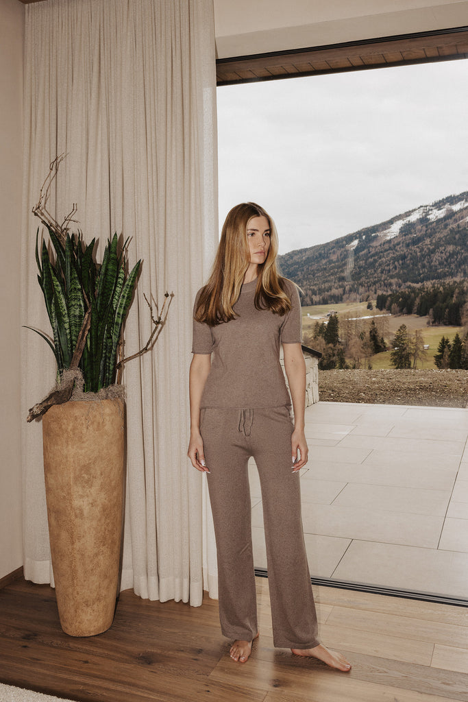 Minkštos ir patogios rudos spalvos kašmyro kelnės su reguliuojamu raišteliu juosmens srityje – tai universalus pasirinkimas, suteikiantis komforto ir šilumos. Dėl savo neutralaus atspalvio jos lengvai derinamos su įvairių spalvų megztiniais, švarkeliais ar palaidinėmis, todėl puikiai tinka tiek laisvalaikiui, tiek kasdieniam stilingam įvaizdžiui.