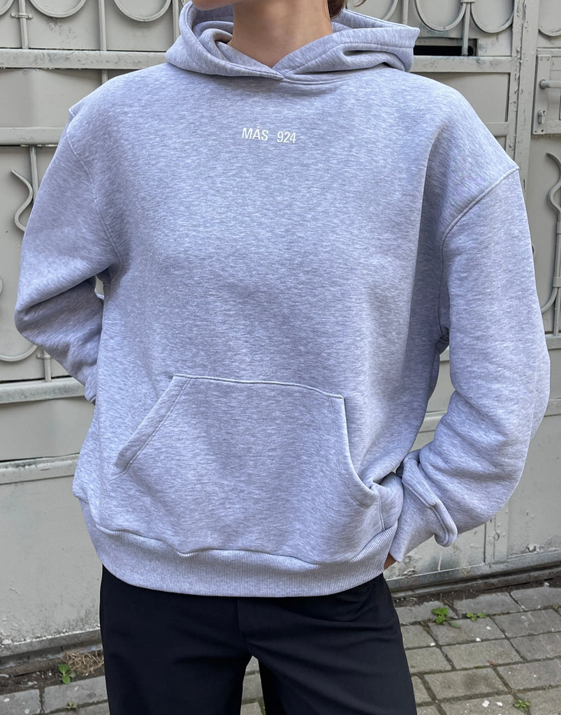 Naujo leidimo unisex pilkas džemperis su MÁS simboliu nugaroje ir minimalistiniu logotipu priekyje.