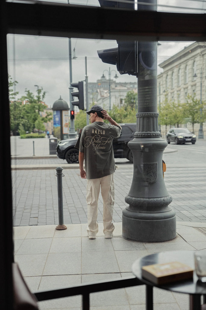 Šie laisvo kirpimo tamsiai mėlyni marškinėliai – tylus priminimas būti čia ir dabar. Pagaminti iš 100% organinės medvilnės, jie siūlo ne tik patogumą – jie atspindi požiūrį. Atsipalaidavęs siluetas natūraliai gula ant kūno, o ryškus nugaros užrašas „Dolce Far Niente“ primena, kad ramybė – tai pasirinkimas, o gebėjimas jausti – tikroji stiprybė.