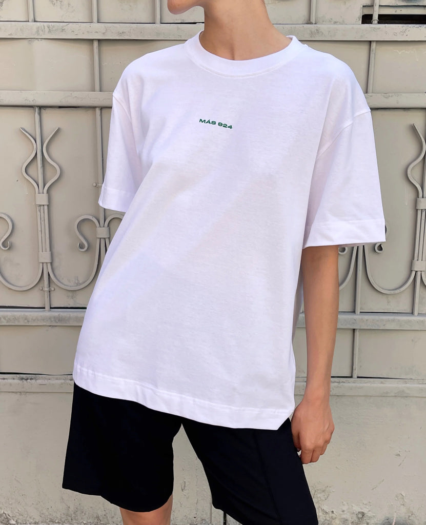 MÁS 924 balti marškinėliai su šilkografija nugaroje. Pagaminta iš standžios medvilnės.
