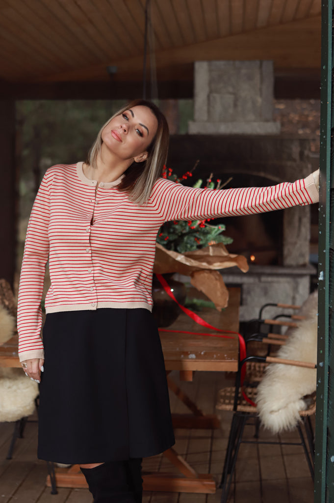 - Uogiškai raudonos spalvos, kuri megztuke maišosi su sviestine sausainine ir suteikia deriniams labai „gardų“ prieskonį.