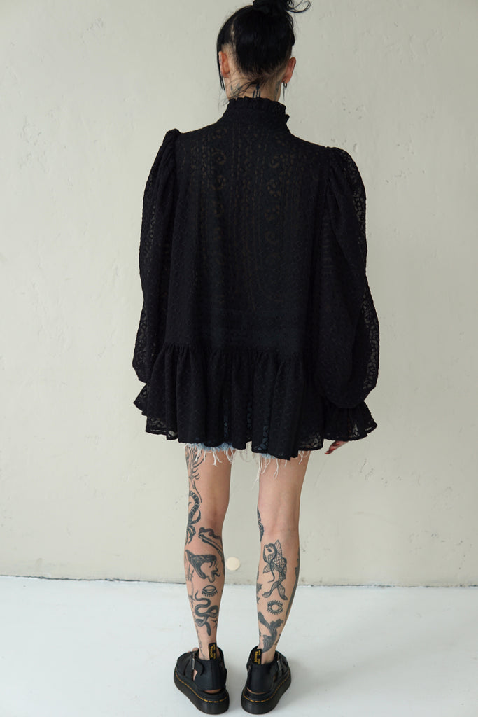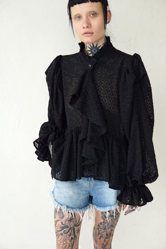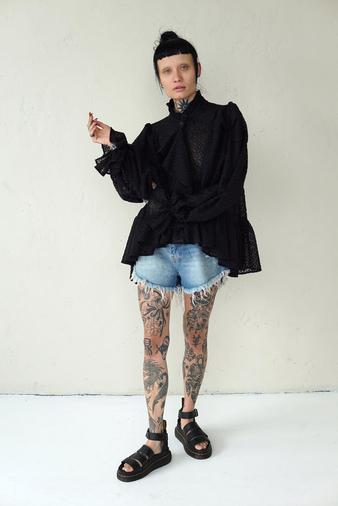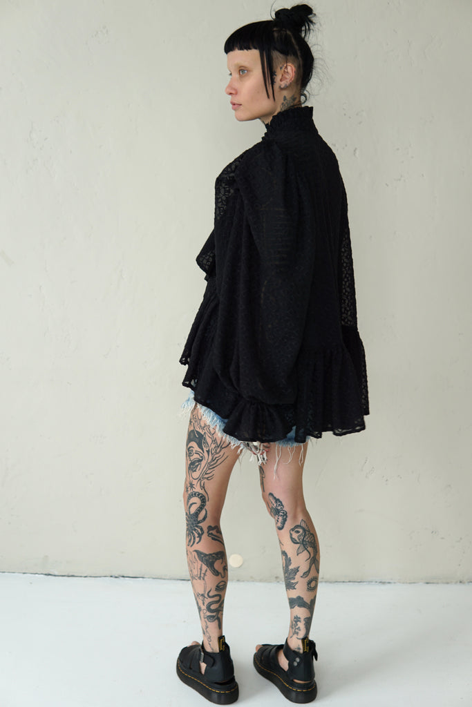 Juoda stilinga palaidinė plačiomis rankovėmis