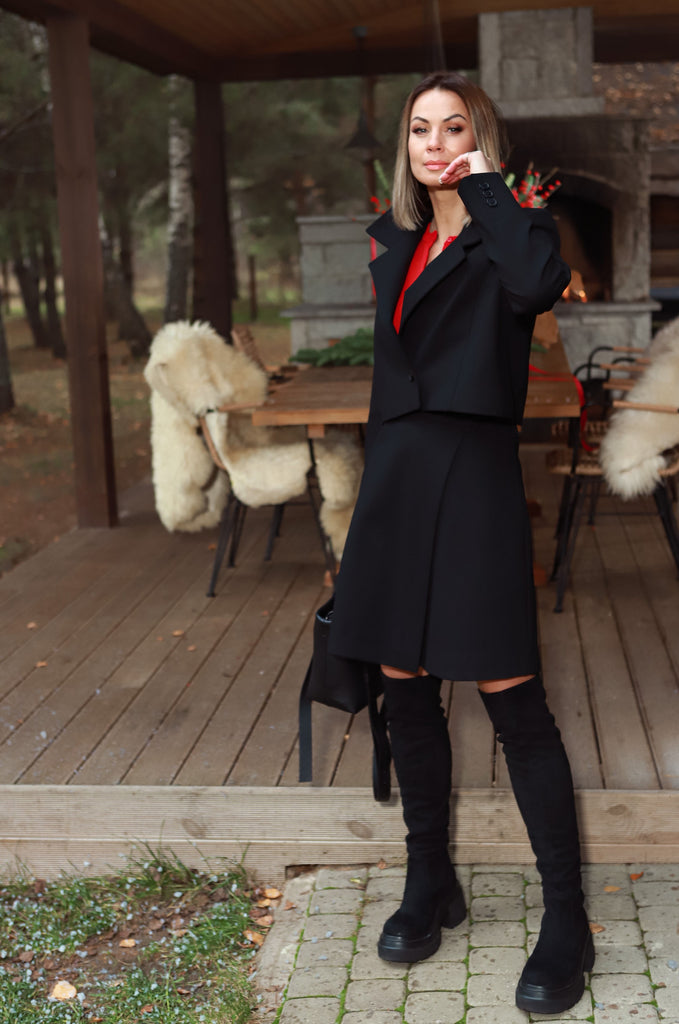 Priešais Jūsų akis- trumpintas švarkutis, kuriam „į geriausius“ draugus „įtaisėme“ iš to paties audinio pasiūtą sijonuką, Kartu jie atrodo puikiai, bet dėl savo nekaprizingų charakterių- abu jau dabar spurda, kaip nori greičiau pademonstruoti derinius, kaip draugiškai moka sugyvent ir su kitais rūbais.