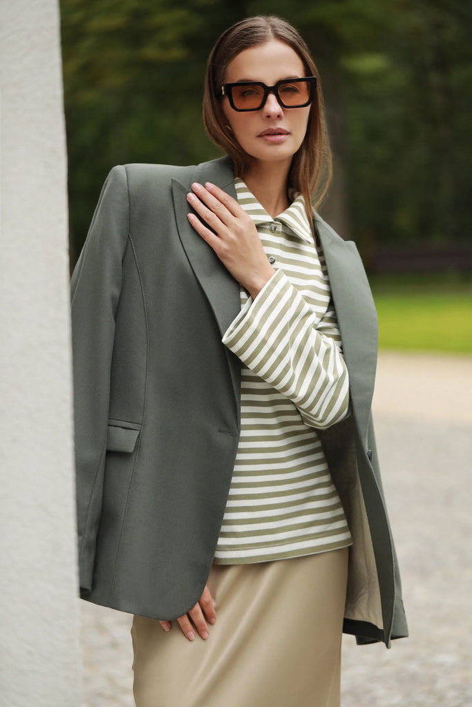 Jau klasika tapęs ir visų moterų spintoje privalantis būti padidinto modelio švarkas. Šis modelis buvo kuriamas bendradarbiaujant kartu stiliste Greta Žvinklyte, kuri ilgametę savo patirtį dirbant stiliste Londone su garsiausiomis pasaulio įžimybėmis nuguldė ir pritaikė mūsų moterims taip, kad idealiai tiktų kiekvienam figūros tipui. Stilistės sprendimu švarko siluetas pasiūtas identifikuojant liemens liniją, nepaisant to, kad modelis yra oversized, taip pabrėžiant moters moteriškumą, bet nei kiek neįpareigojant.