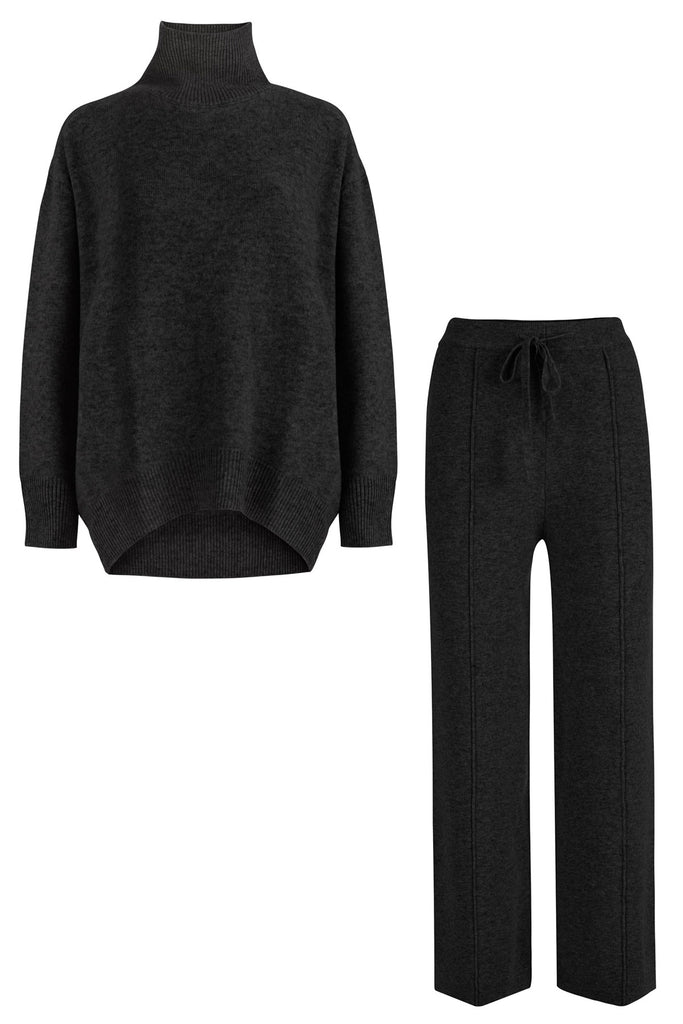 Šis merino vilnos ir kašmyro kostiumas susideda iš dviejų dalių – “oversized” megztinis golfas ir plačios kelnės dekoruotos kantu. Abu drabužiai yra lengvai pritaikomi dėvint kartu ir atskirai. Stilingi, šilti, aukštos kokybės. Kreminė spalva klasika – tinkanti prie daugelio kitų atspalvių. Kostiumas idealiai tiks žiemai, bet lengvai pritaikysite ir rudens bei pavasario sezonais. Užsivilkus storesnį vilnos švarką ant viršaus, sukursite labai gražų kasdienį įvaizdį į darbą. Kelnės klasikinės gali būti dėvimos ir su kitais Jūsų mėgstamais megztiniais arba švarkais. Platus modelis, tinka įvairioms figūroms, kantas prailgina siluetą ir dailina kojas.