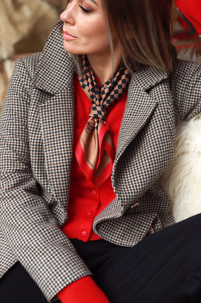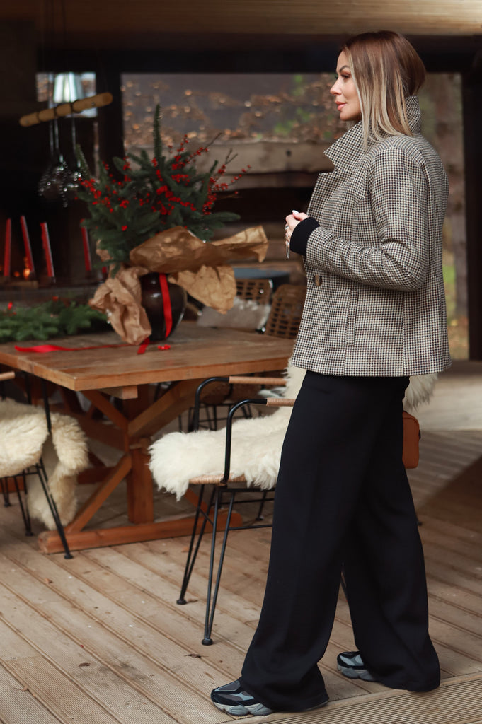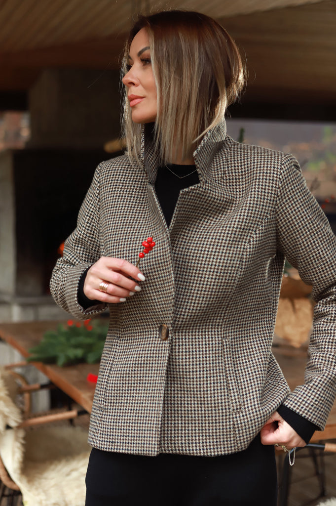 - Pasiūtas iš formą puikai laikančio stilingai languoto audinio, kurio sudėtyje yra vilnos. Tobulai tiks toms, kurios nemėgsta „besikandžiojančių“, pilnai vilnonių švarkų.